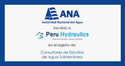 Estimados amigos queremos expresar nuestra satisfacción, dado que, según resolución directoral N° 100 - 2015 - ANA - DARH, hacemos de su conocimiento la inscripción que Perú Hydraulics obtuvo en calidad de Consultor de Estudios de Agua Subterráneas, en el registro de empresas autorizadas, otorgado por el Ministerio de Agricultura a través de la Autoridad Nacional del Agua.